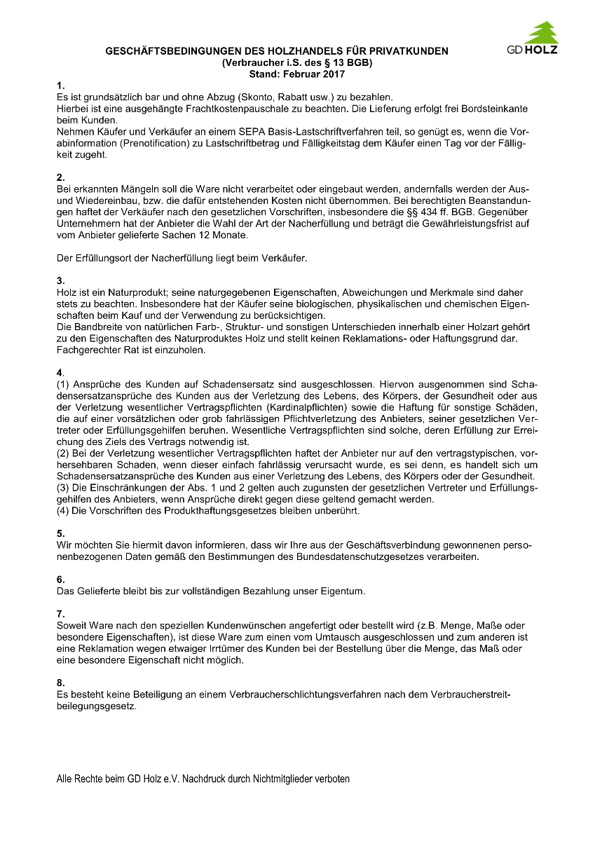 GESCHÄFTSBEDINGUNGEN DES HOLZHANDELS FÜR PRIVATKUNDEN (Verbraucher i.S. des § 13 BGB) Stand: Februar 2017 - Bei Vertragsabschluss in unseren Ausstellungen.